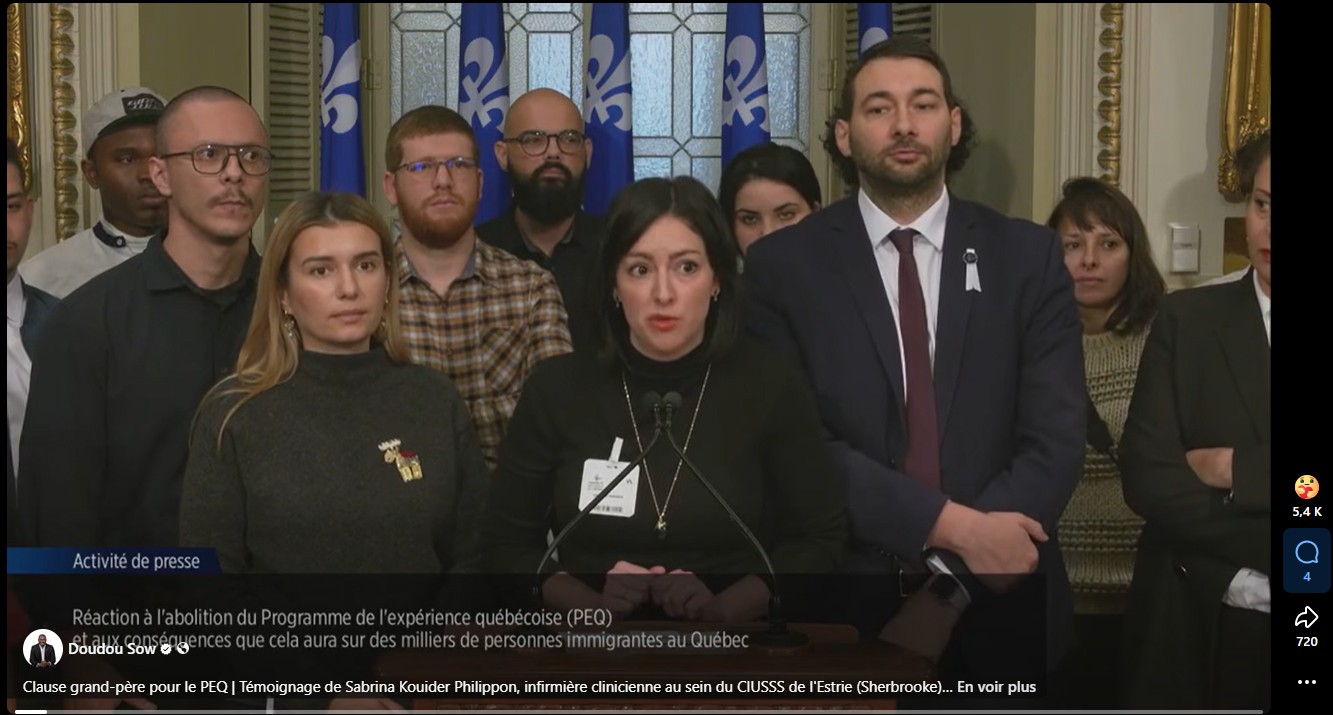 Image : Témoignage poignant de Sabrina Kouider Philippon, infirmière clinicienne au sein du CIUSSS de l’Estrie lors du point de presse de M. Guillaume Cliche-Rivard, porte-parole du deuxième groupe d’opposition en matière d’immigration, de francisation et d’intégration, Assemblée nationale du Québec. « Les gouvernements peuvent changer les règles, mais elles ne doivent pas avoir un […]