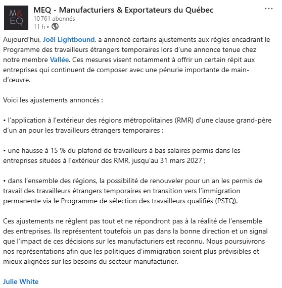 Ces ajustements ne règlent pas tout et ne répondront pas à la réalité de l’ensemble des entreprises. Ils représentent toutefois un pas dans la bonne direction et un signal que l’impact de ces décisions sur les manufacturiers est reconnu. Nous poursuivrons nos représentations afin que les politiques d’immigration soient plus prévisibles et mieux alignées sur les besoins du secteur manufacturier ».